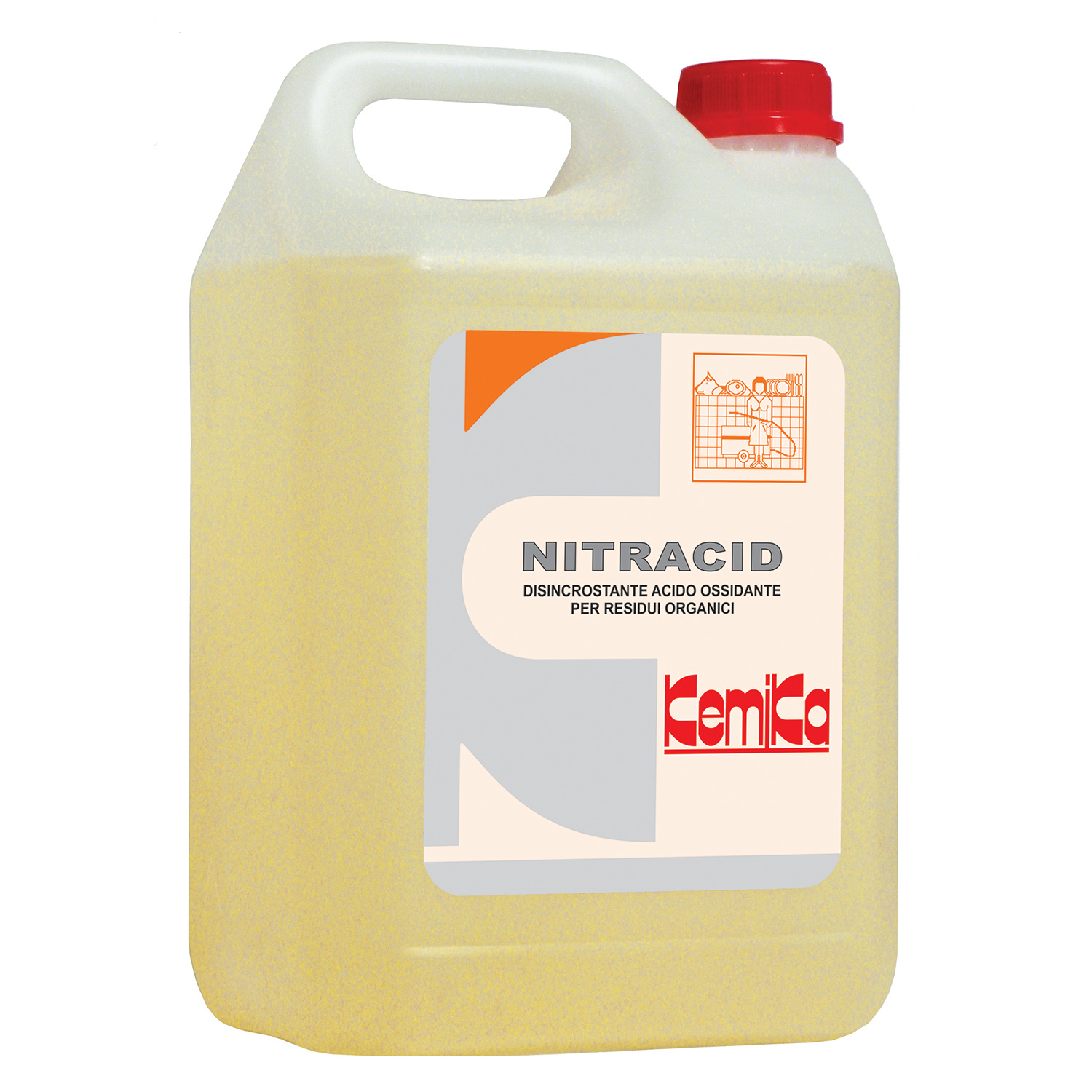 NITRACID is a descaling detergent formulated with nitric acid and low foam surfactants to remove organic scales and in particular calcareous and organic residues, milk, cheese, beer and fruit juice residues.