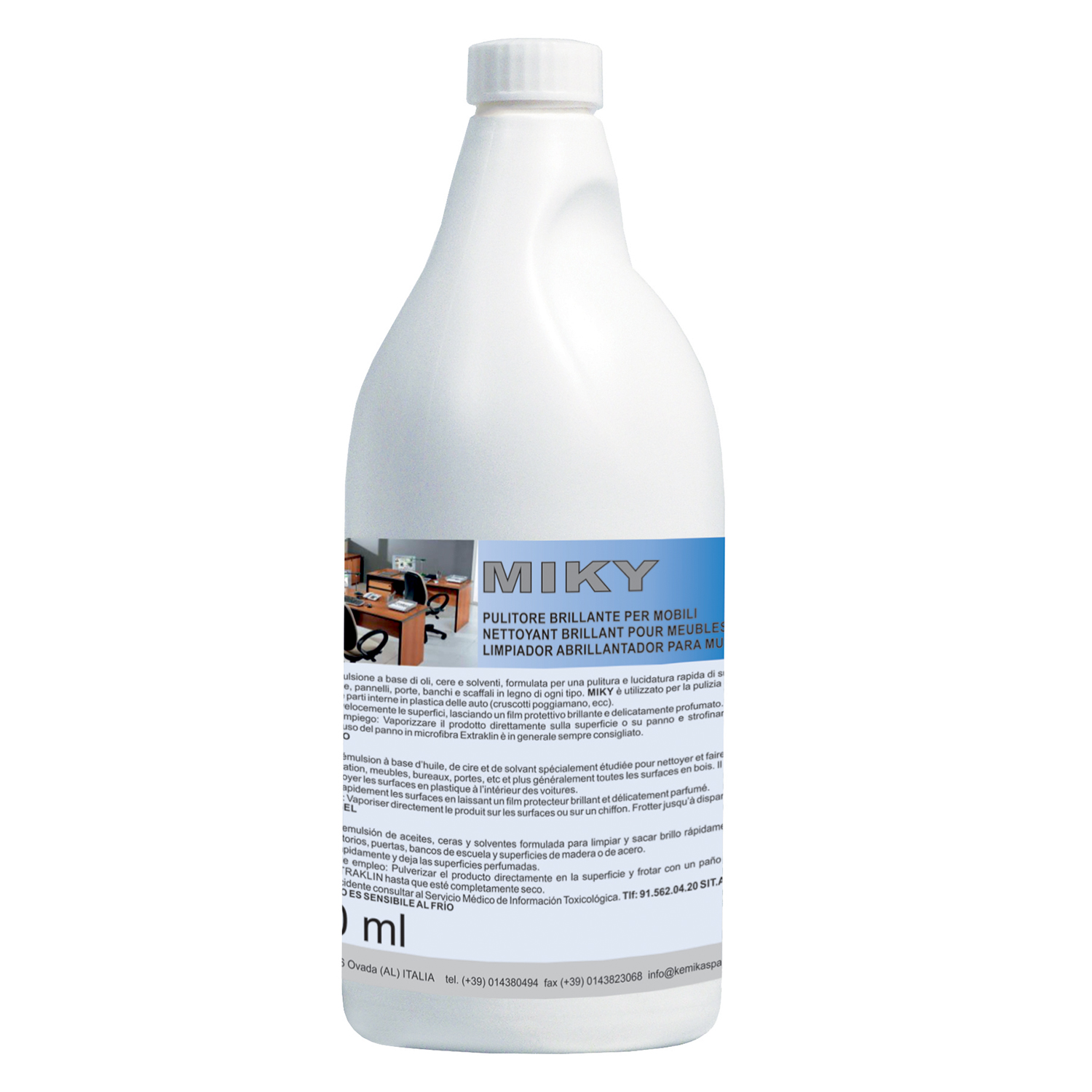 Emulsion pour éliminer la poussière et pour le lustrage rapide des meubles. MIKY nettoie et laisse un film de protection brillant. Adéquat même pour le nettoyage des meubles en acier Inox.