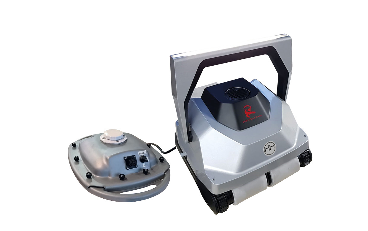 Robot pulitore a batterie per vasca di piscina (fondo e pareti) di lunghezza massima di 15 m. Dotato di carrello di trasporto, radiocomando e luce led sul manico trasporto.