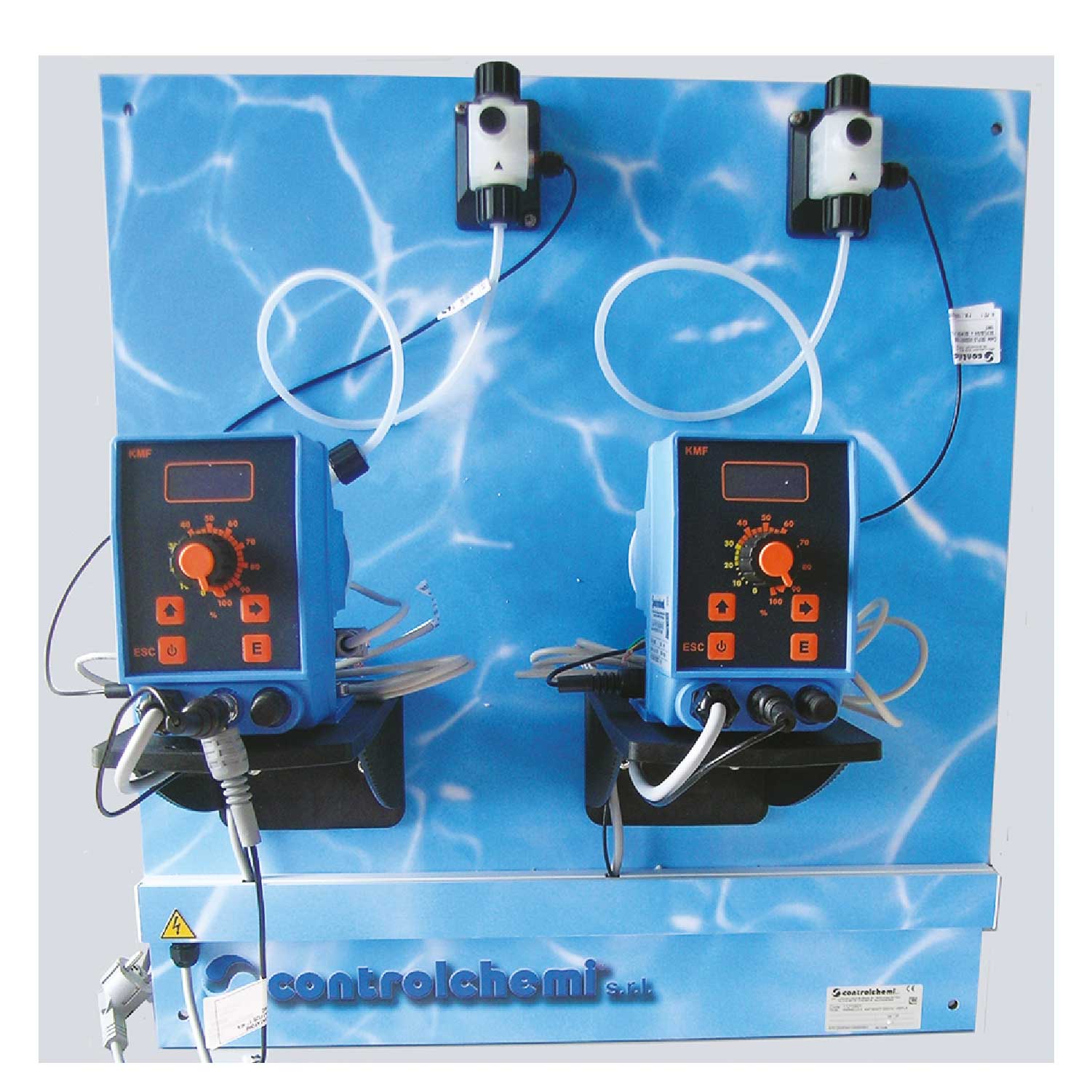Pannello per il trattamento di prevenzione della Legionella. Con due pompe dosatrici: una pompa per l'igienizzante Klorosan e una pompa per l'additivo protettivo Aquasan.