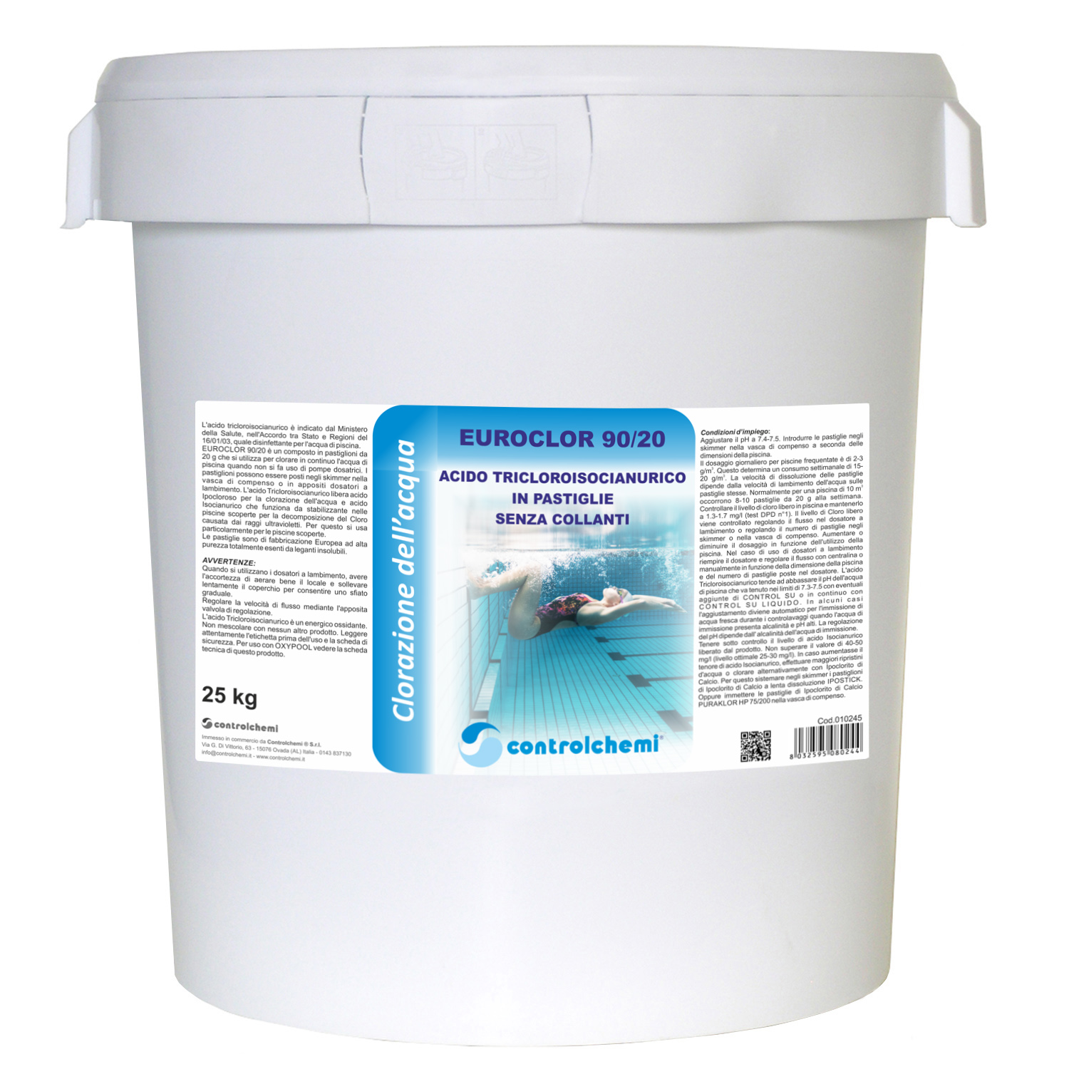 EUROCLOR 90/20 è un composto in pastiglie da 20 g che si utilizza per clorare in continuo l’acqua di piscina quando non si fa uso di pompe dosatrici.