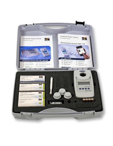 La valigetta include 100 pastiglie per ciascuna determinazione (DPD 1, DPD 3, Rosso Fenolo,Cya Test).
