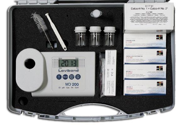 La valigetta include 100 pastiglie per ciascuna determinazione (DPD 1, DPD 3, Rosso Fenolo, Cya Test, Alkalinità totale e Durezza da Calcio).