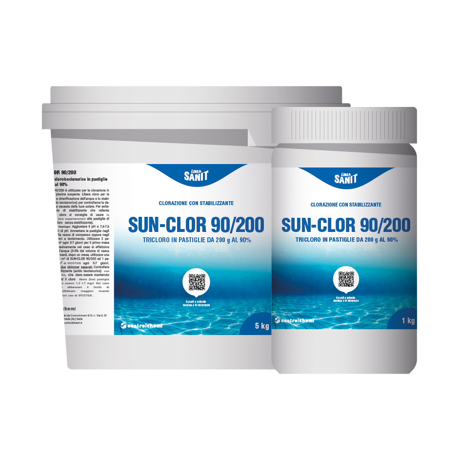 SUN-CLOR 90/200 è utilizzato per la clorazione in continuo di piscine scoperte. Libera cloro per la disinfezione e