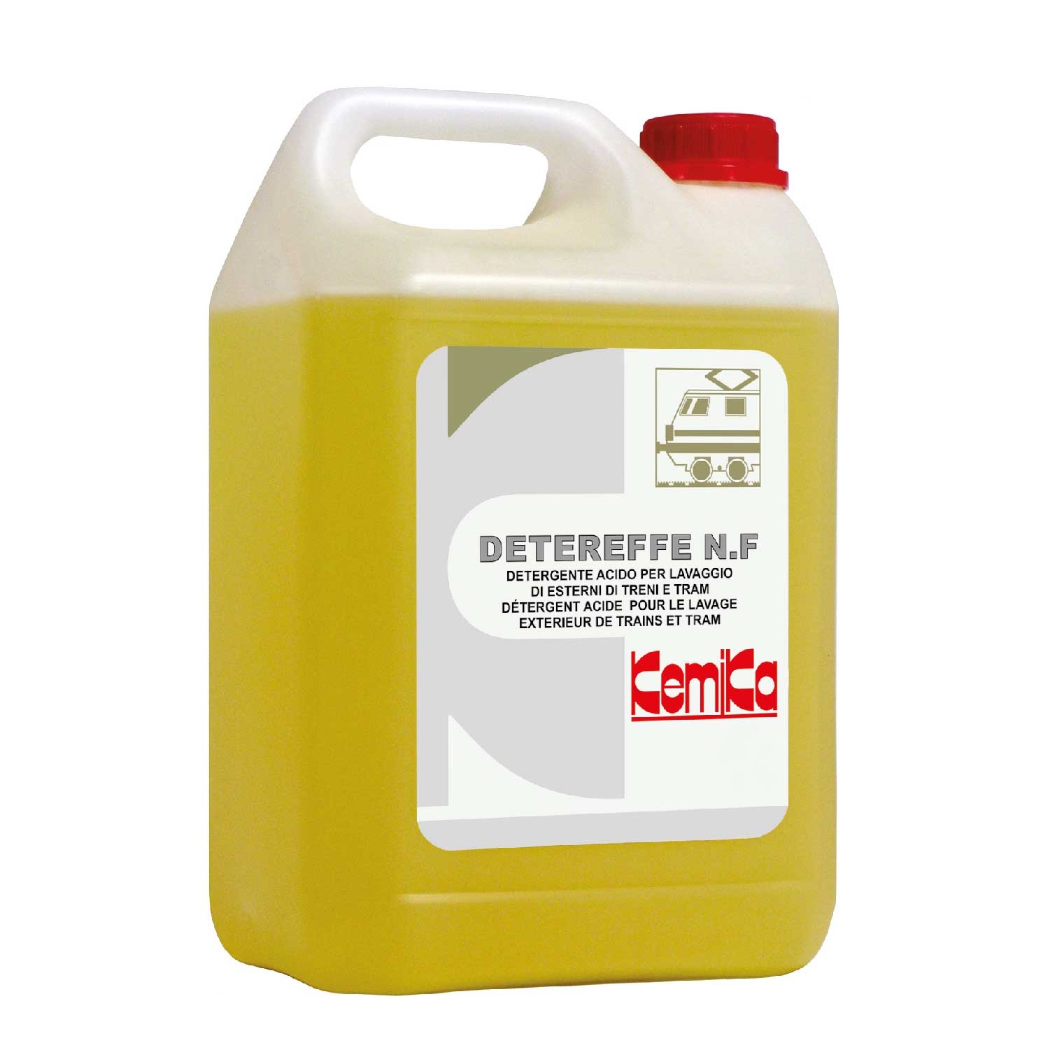 Detergente acido per il lavaggio degli esterni di tram e carrozze ferroviarie. Elimina i residui ferrugginosi e calcarei. Consistenza leggermente viscosa per un miglior ancoraggio alla superficie.