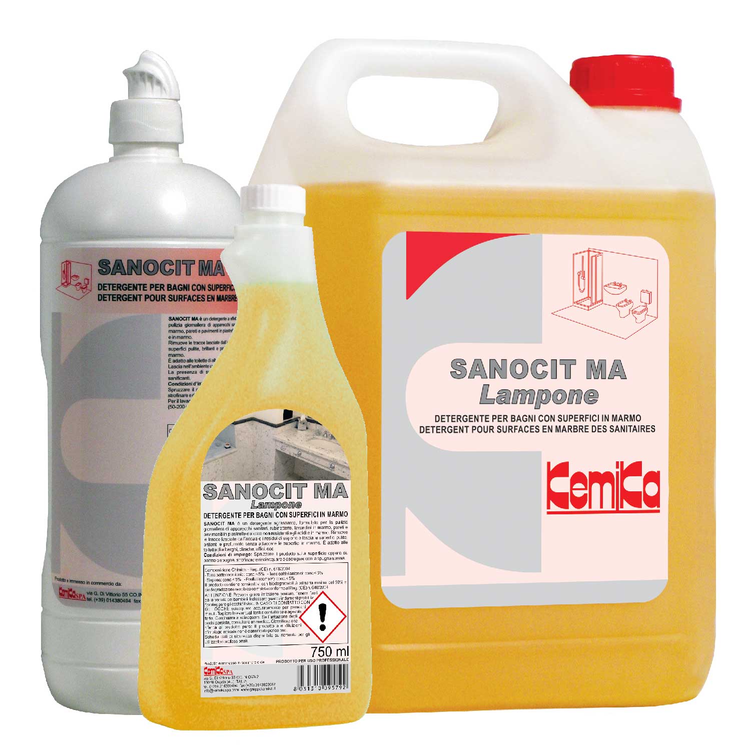 Ha effetto detergente, anticalcareo e deodorante e si usa al posto di SANOCIT quando si hanno nel bagno superfici in marmo. L’effetto anticalcareo è realizzato con l’uso di agenti sequestranti. È disponibile con pistola ed erogatore a schiuma.
